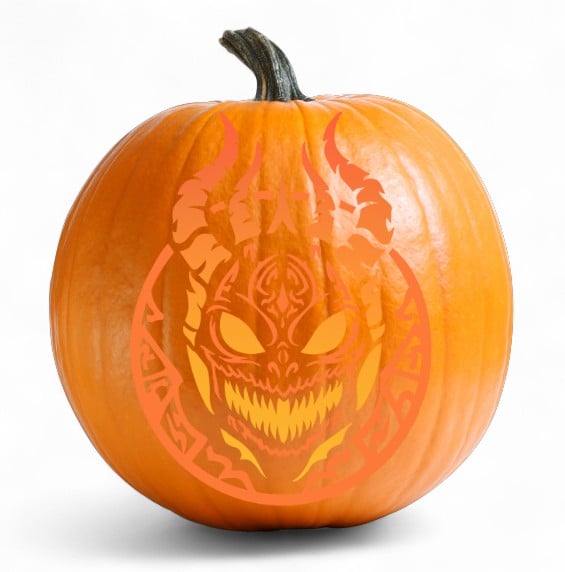 Summon pure Halloween chaos with this wicked Demon Horns stencil. With its sharp fangs, glowing eyes, and horned crown of flames, this design turns any pumpkin into a fiery masterpiece. Perfect for advanced carvers who want to unleash their dark side and create a jaw-dropping centerpiece for Halloween night.